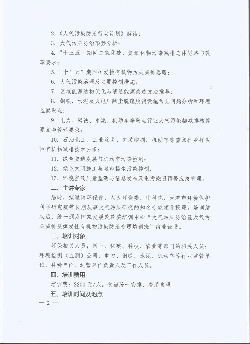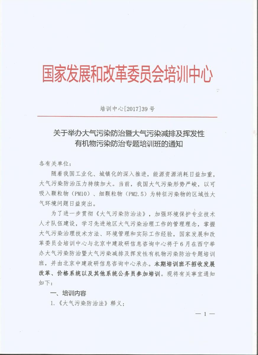 为进一步贯彻《大气污染防治法》,国家发改委培训中心针对大气污染减排及挥发性有机物污染防治举办专题培训班。现将国家发改委培训中心文件转发给你们,各单位积极参加,学习期满,颁发国家发改委结业证书。